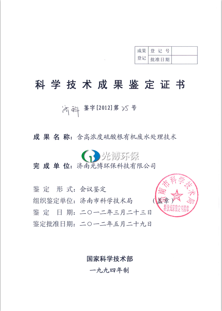 济南光博含高浓度硫酸根有机废水处理技术成果鉴定书