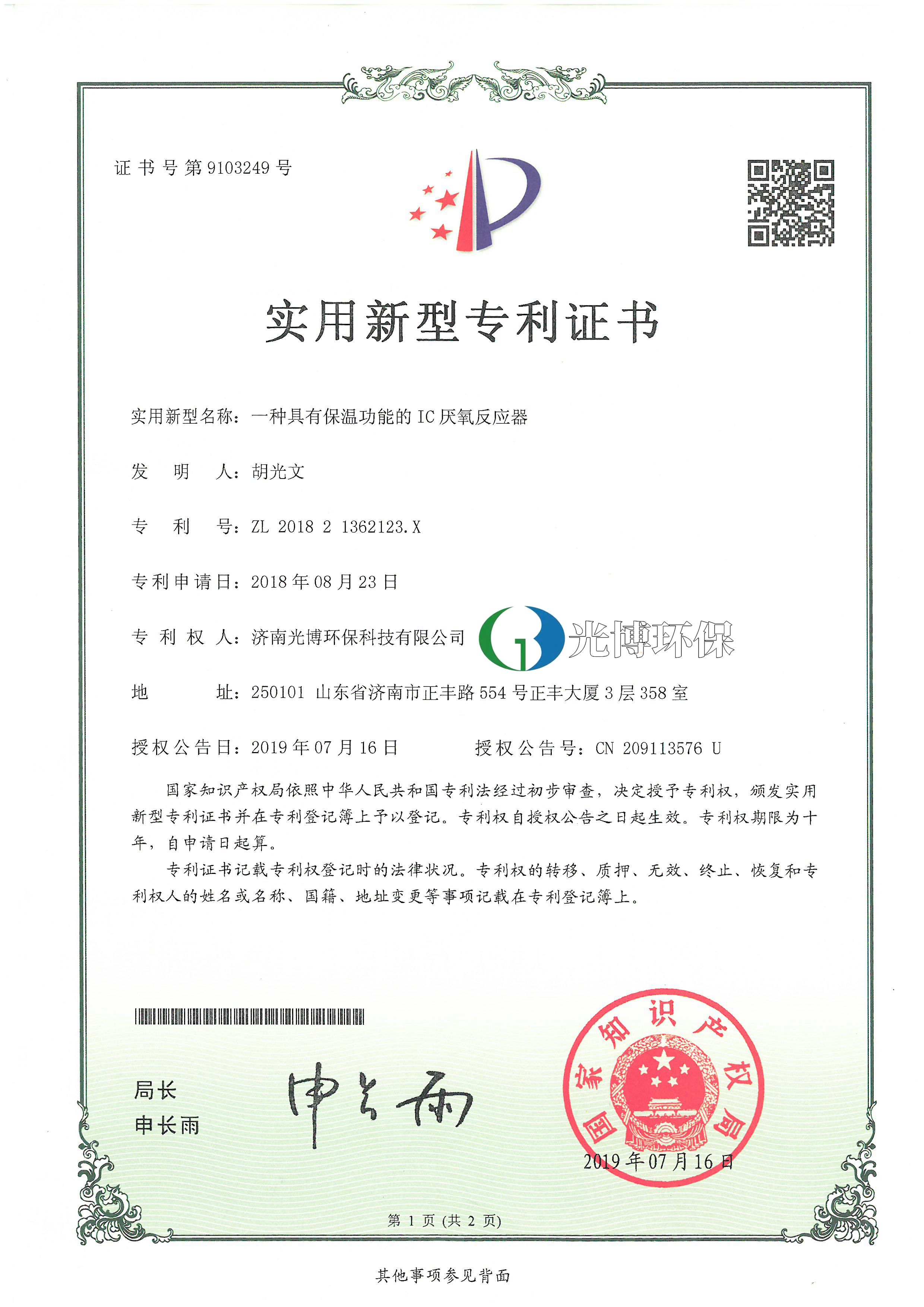实用新型专利证书-保湿功能的IC厌氧反应器