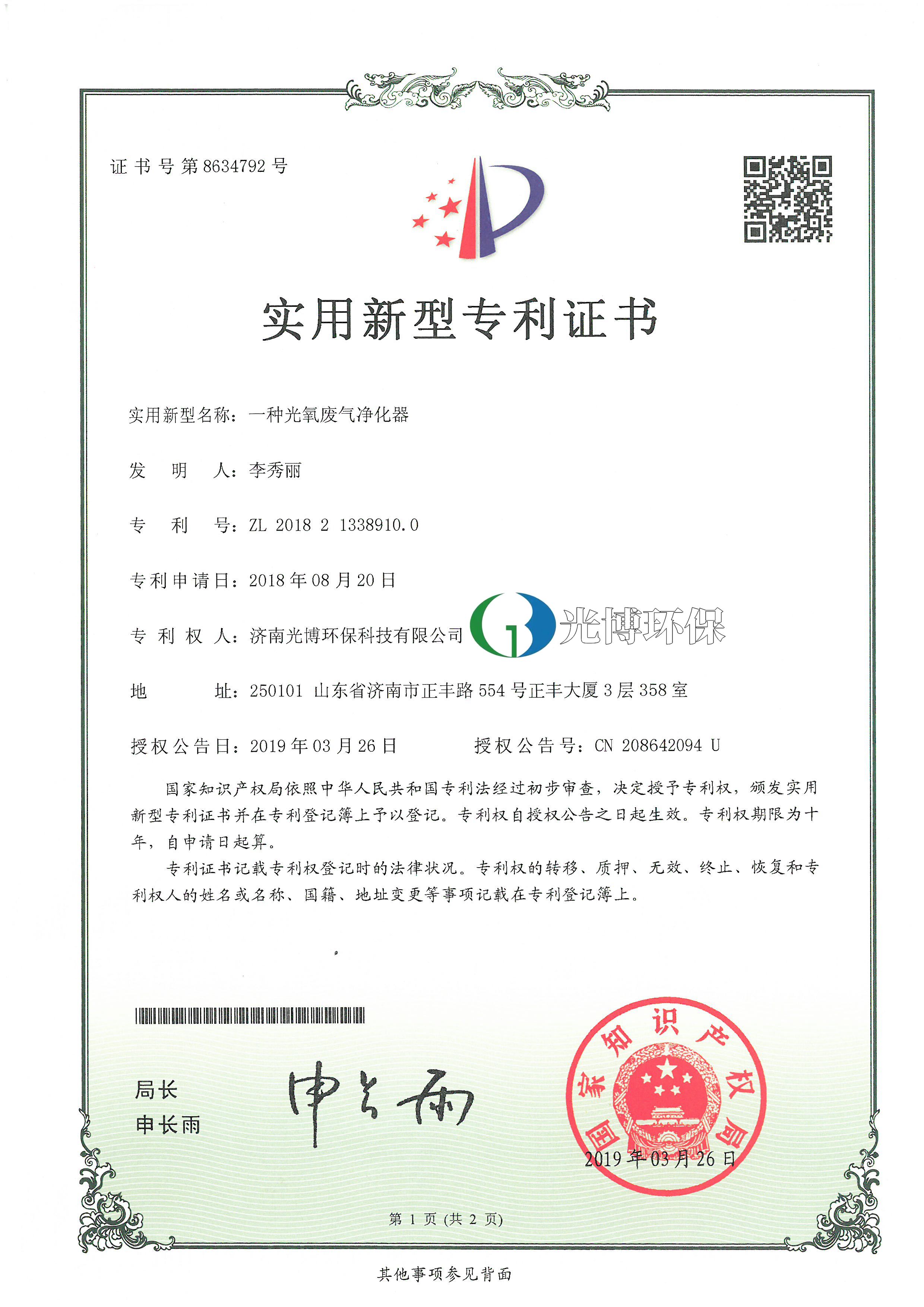 实用新型专利证书-光氧废气净化器