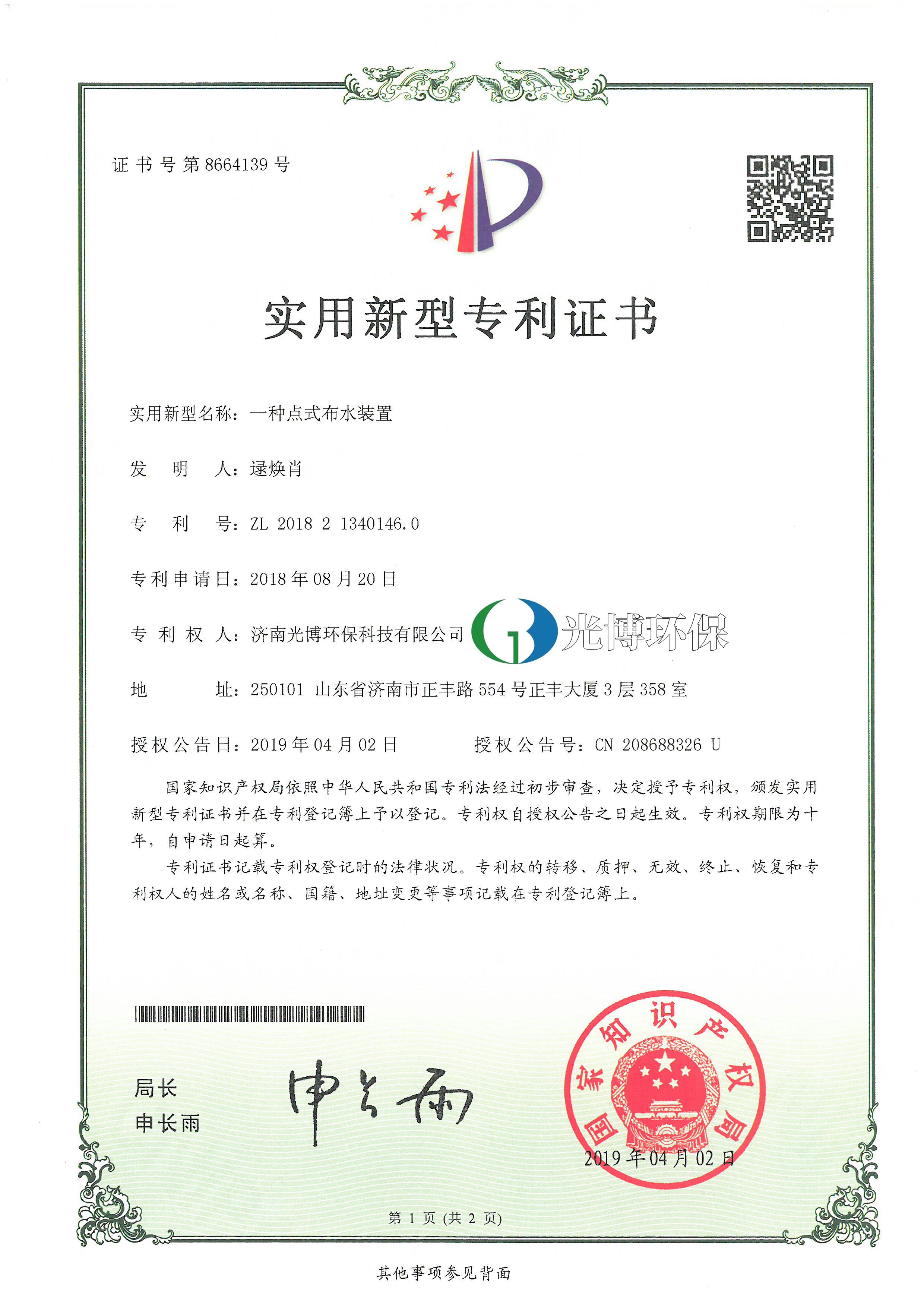 实用新型专利证书-点式布水装置