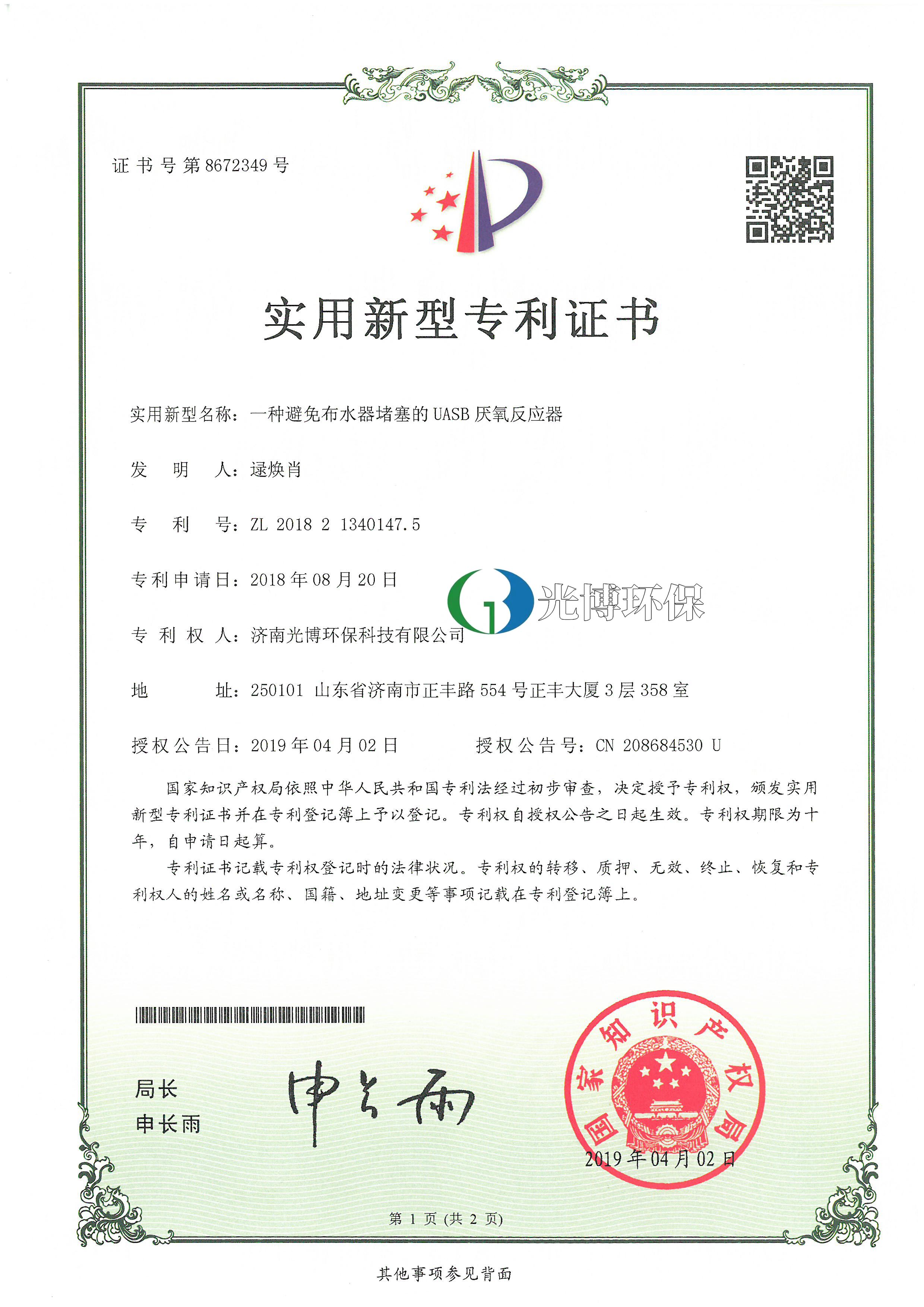 实用新型专利证书-避免布水器堵塞的UASB厌氧反应器