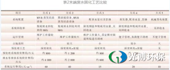 第1种和第2种方式采用蒸发结晶作为污水固化工艺,投资和长期运行费用较大,但可以回收部分冷凝水。第2种方式污水经过浓缩可大大降低蒸发结晶系统的投资费用。