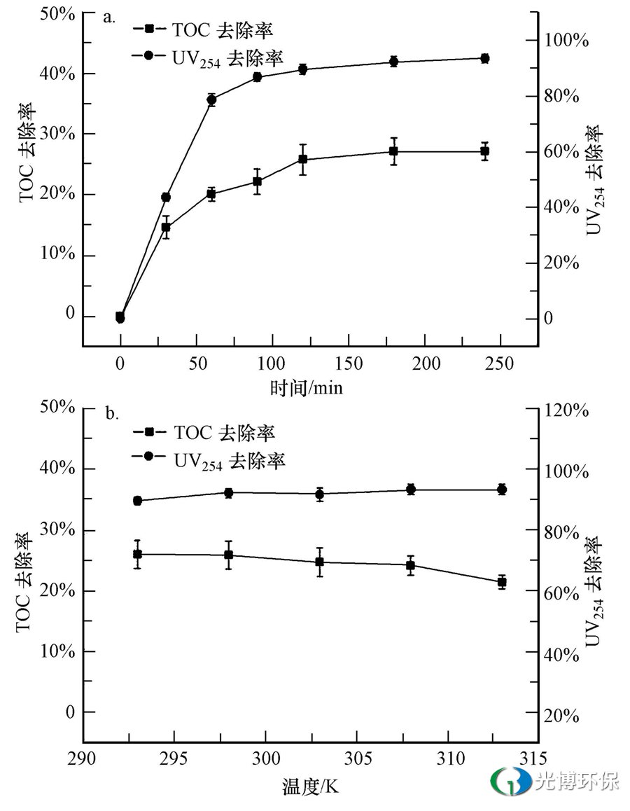 由图 4a可见,随反应进程,TOC和UV254的去除率均随之提高.在0~60 min内,TOC与UV254的去除率均随时间快速提升;60~120 min内,TOC去除率随时间提升幅度变小,UV254的去除率基本不变;120~240 min内,TOC和UV254的去除率变化很小,在统计学误差范围内.结合能耗考虑,确定VUV/US适宜的反应时间为120 min.