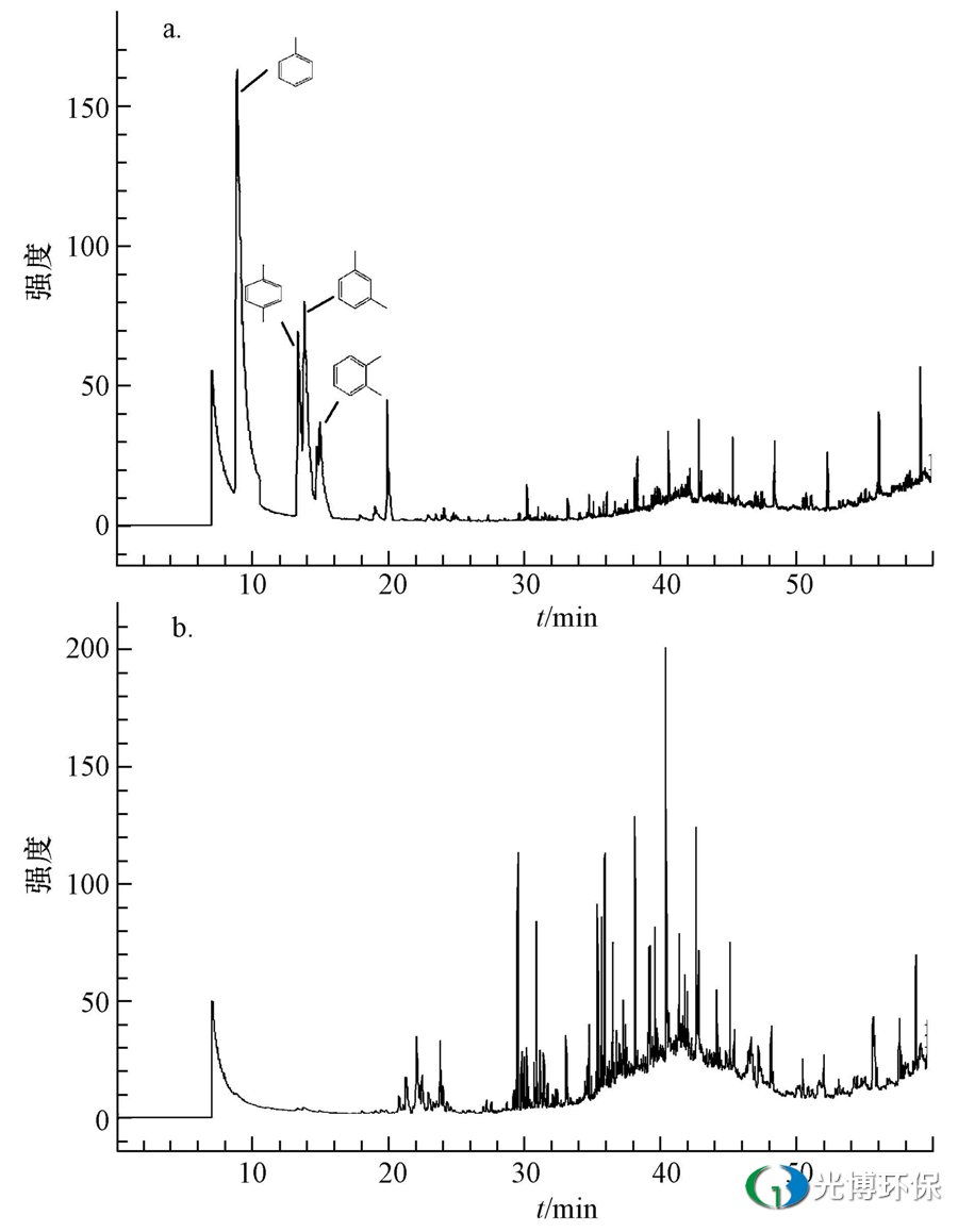 图 6 水样总离子流色谱图(a. 处理前水样;b. 反应120 min后水样)