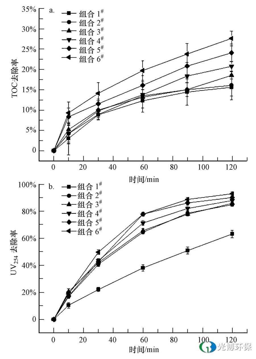 由图 2b可看出,反应120 min,组合1#~6#对UV254的去除率分别为63.19%、84.95%、85.89%、87.96%、90.15%及93.03%.其与TOC去除规律类似,即相同US功率下,VUV功率越大者,UV254的去除率越高;相同VUV功率下,US功率越大,UV254的去除率越高.