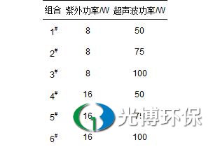 为确定VUV/US的最佳功率组合,考察了不同功率组合(表 1)对印染废水尾水的处理效果(图 2).